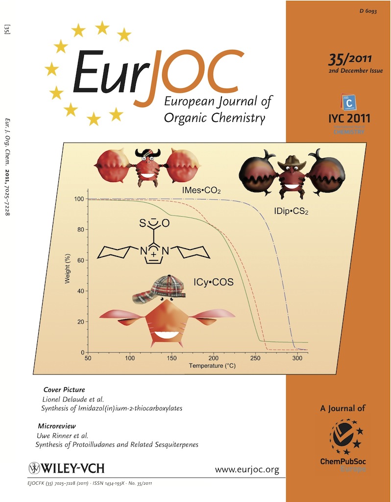 Abstract: Five imidazol(in)ium-2-thiocarboxylates bearing cyclohexyl, mesityl, or 2,6-diisopropylphenyl substituents on their nitrogen atoms were prepared from the corresponding imidazol(in)ium chlorides or tetrafluoroborates in a one-pot, two-step procedure involving the in situ generation of free N-heterocyclic carbenes (NHCs) with a strong base followed by trapping with carbonyl sulfide. The resulting NHC·COS zwitterions were isolated in high yields and characterized by IR and NMR spectroscopy. The molecular structure of SIMes·COS was determined by X-ray diffraction analysis. Experimental data and DFT calculations indicated that the negative charge on the thiocarboxylate anion is preferentially delocalized on the sulfur atom. Thermogravimetric analysis showed that the NHC·COS zwitterions undergo thermolysis at temperatures ranging between 110 and 180 °C in the solid state. They are also rather labile in solution. Unlike the related NHC·CS2 betaines, which are highly stable, crystalline materials, they displayed the same type of behavior as the analogous carboxylate adducts, which readily lose their CO2 moiety upon heating or dissolution. Thus, imidazol(in)ium-2-thiocarboxylates acted as convenient NHC precursors in two model organocatalytic transformations. Of the five thiocarboxylates examined, ICy·COS was the most efficient at promoting the acylation of benzyl alcohol with vinyl acetate, whereas SIMes·COS afforded the highest activity in benzoin condensation.